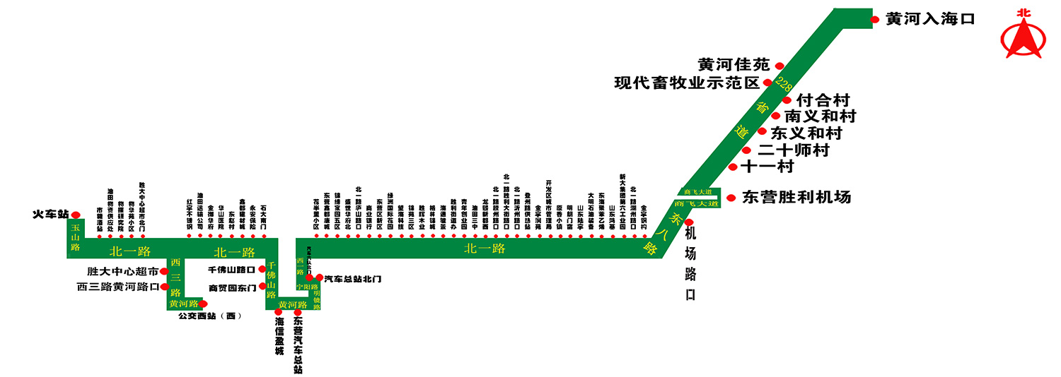 下行自公交西站始發(fā),經(jīng)黃河路、西三路、北一路、玉山路(火車站調(diào)頭)、北一路、千佛山路、黃河路、明鏡路、寧陽路、西一路、北一路、東八路、商飛大道(勝利機(jī)場調(diào)頭)、東八路、228省道、024鄉(xiāng)道到達(dá)終點(diǎn)站“黃河入??凇保簧闲邪瓷鲜雎肪€返回。