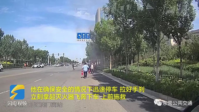 近日,東營(yíng)38路公交車駕駛員李斌行駛至菏澤路與西三路路口西100米附近看到前方濃煙滾滾,他在確保安全的情況下迅速停車,拉好手剎,立刻拿起滅火器飛奔下車,上前施救。原來是一輛電動(dòng)三輪車突然自燃冒煙,同時(shí)車上還攜帶大量電動(dòng)單車,為了防止火勢(shì)迅速蔓延,他迅速撲救,火勢(shì)得到了控制。