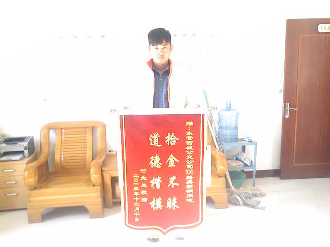 12月15日,家住南一路桐鳳小區(qū)的付玉先生拿著一面寫(xiě)有“拾金不昧、道德楷?!钡腻\旗來(lái)到市公交公司汽車(chē)四隊(duì),感謝車(chē)隊(duì)駕駛員吳新桐師傅拾金不昧的高尚品德。