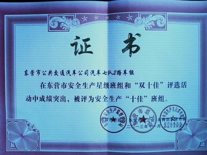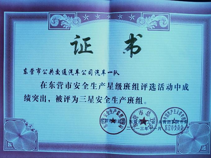 2012年開始,市公交公司按照安全生產(chǎn)標(biāo)準(zhǔn)化要求,不斷完善、補(bǔ)充安全檔案資料,在今年市安全生產(chǎn)監(jiān)督管理局、市總工會、共青團(tuán)東營市委組織的創(chuàng)建星級安全生產(chǎn)班組和十佳班組活動(dòng)中,市公交公司汽車一隊(duì)、汽車七隊(duì)2路車組分別被評為三星安全生產(chǎn)班組和安全生產(chǎn)十佳班組。