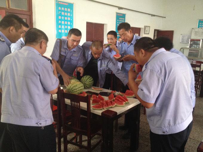 7月13日,三隊(duì)駕駛員楊海衛(wèi)自己買來(lái)2000斤西瓜,給在酷暑中堅(jiān)守工作的廣大工友送來(lái)絲絲清涼。