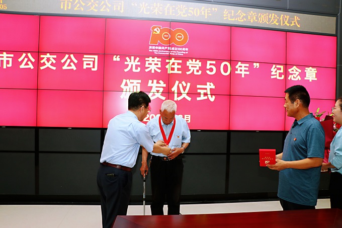 6月24日上午,在中國(guó)共產(chǎn)黨成立100周年即將到來(lái)之際,東營(yíng)公交組織開(kāi)展了“光榮在黨50年”紀(jì)念章頒發(fā)儀式。公司黨委書(shū)記趙龍、經(jīng)理劉海、副經(jīng)理孫紅光、景洪培和黨齡50周年老黨員以及黨員代表等參加了頒發(fā)活動(dòng)。