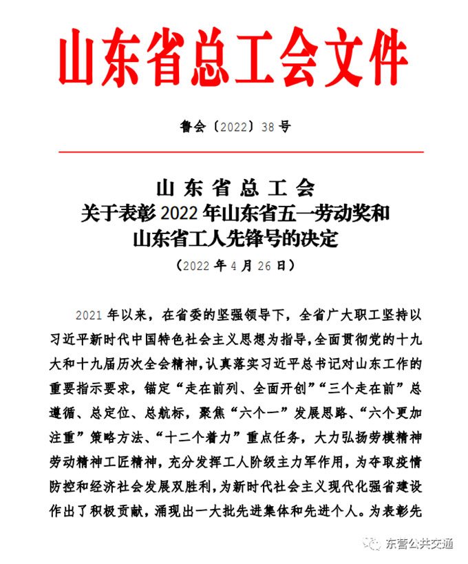 為進(jìn)一步激勵(lì)廣大職工在新時(shí)代勇?lián)率姑?,展現(xiàn)新作為,“五一”前夕,山東省總工會(huì)和東營(yíng)市總工會(huì)先后印發(fā)通報(bào)表彰,對(duì)省市多家先進(jìn)集體和個(gè)人進(jìn)行表彰,東營(yíng)市公共交通汽車公司駕駛員黃新強(qiáng)同志被評(píng)為山東省五一勞動(dòng)獎(jiǎng)?wù)?,東營(yíng)市公共交通汽車公司9路車組被評(píng)為東營(yíng)市工人先鋒號(hào)。