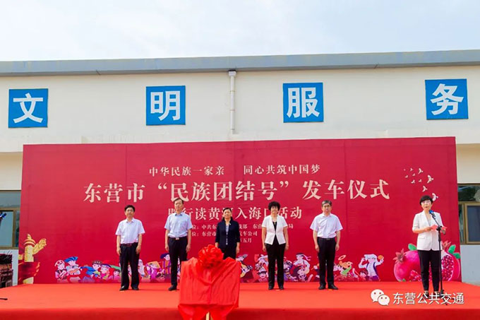 儀式現(xiàn)場,民族團(tuán)結(jié)號公交車整裝待發(fā),車身煥然一新,貼有“中華民族一家親、同心共筑中國夢”“各民族像石榴籽一樣緊緊擁抱雜一起”等字樣,融入東營民族團(tuán)結(jié)進(jìn)步“石榴籽”“石榴花開黃河口”等地域元素,生動(dòng)展示了各民族群眾在黃河入??跀y手團(tuán)結(jié)奮斗、共創(chuàng)美好生活的故事,市公交公司黨委書記趙龍同志現(xiàn)場就民族團(tuán)結(jié)號公交車籌備情況作了匯報(bào)。市交通運(yùn)輸局黨組成員、市鐵路港航發(fā)展中心主任朱勝勇致辭,市人大常委會副主任張敏,市政協(xié)副主席王新明為東營市民族團(tuán)結(jié)號揭牌,市委常委、統(tǒng)戰(zhàn)部部長郭艷發(fā)表講話,并宣布東營市民族團(tuán)結(jié)號發(fā)車。