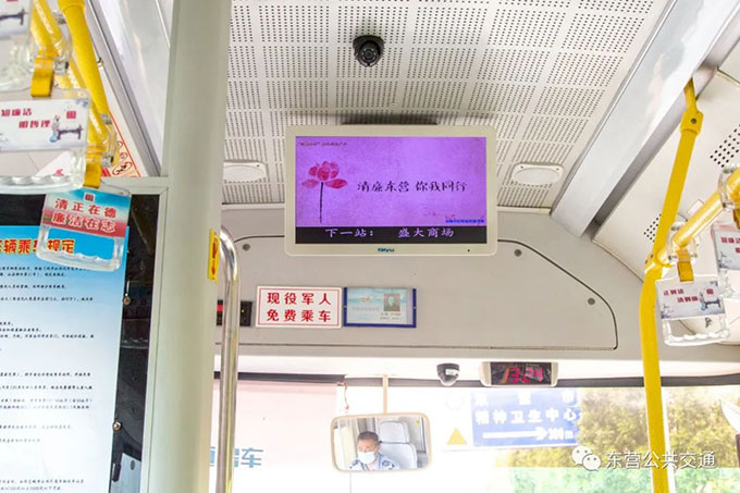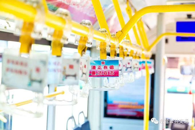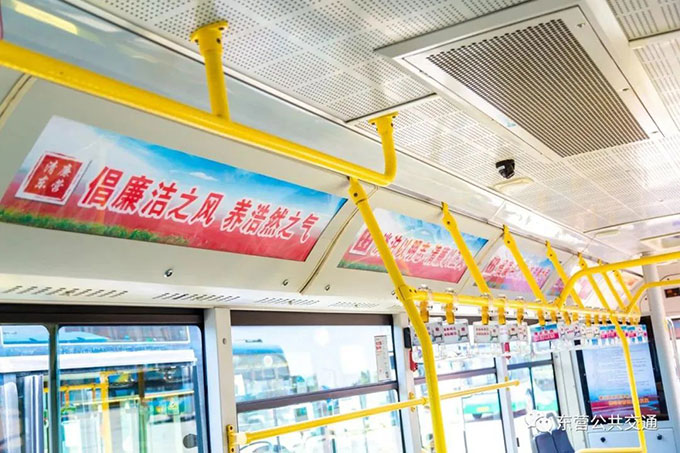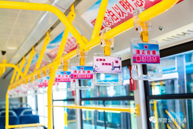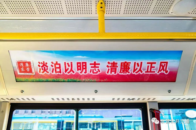 該專線在車體兩側(cè)貼有融入東營本土地域特色的廉潔文化廣告,車廂內(nèi)燈箱、拉手環(huán)等部位,設(shè)計(jì)植入了廉潔名言警句等廉潔元素,公交車車載電視媒體平臺循環(huán)播放廉潔文化微視頻、微電影以及動漫視頻,讓市民充分感受“進(jìn)車有廉、抬頭見廉”廉潔文化氛圍,在乘車中感受廉潔文化熏陶,自覺將思廉、崇廉、尚廉意識轉(zhuǎn)化為守廉、踐廉行動。