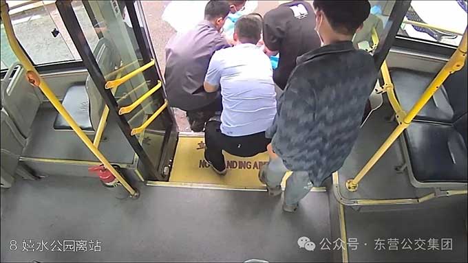 6月2日晚高峰,東營(yíng)街頭車(chē)水馬龍。17時(shí)35分,8路公交駛離東趙大廈站,司機(jī)高希明從后視鏡發(fā)覺(jué)有些異常:一名剛換座的乘客低垂著頭,臉上也不正常,緊接著身體緩緩滑落在車(chē)廂地板上。