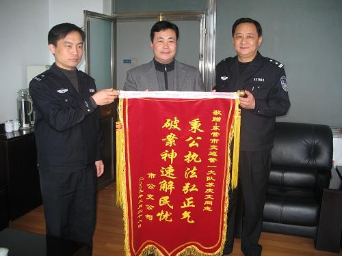 3月2日,為感謝交警部門秉公執(zhí)法,伸張正義,市公交公司委派汽車一隊(duì)的兩位隊(duì)長(zhǎng)向事故處理中心干警蘇慶文同志贈(zèng)送了“破案神速解民憂,秉公執(zhí)法弘正氣”的錦旗。