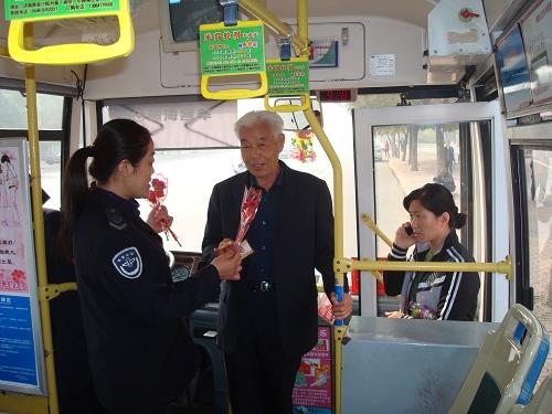 九九重陽節(jié)當天,市公交公司8路車組的駕駛員們自費購買了鮮花送給沿途上車的老年乘客,為他們奉上一份溫馨的祝福。