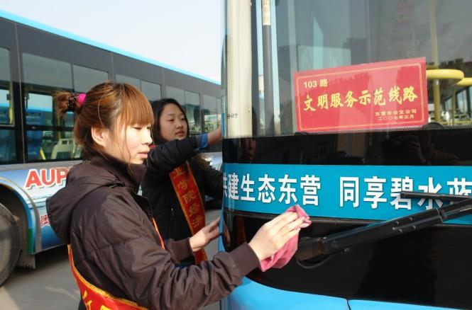 來(lái)自東營(yíng)市職業(yè)學(xué)院經(jīng)濟(jì)系的大學(xué)生和汽車一隊(duì)職工共計(jì)30余人,分成六個(gè)小組,上午幫助駕駛員擦拭車身,打掃車廂,下午乘坐公交車為特需乘客服務(wù)。