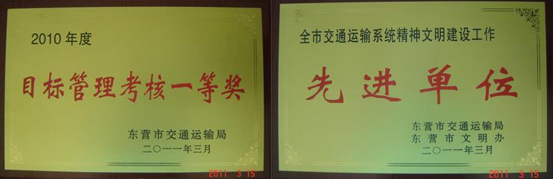 2011年3月11日,在全市交通運輸系統(tǒng)工作會議上,市公交公司被市交通運輸局授予“2010年度目標管理考核一等獎”、“全市交通運輸系統(tǒng)精神文明工作先進單位”。