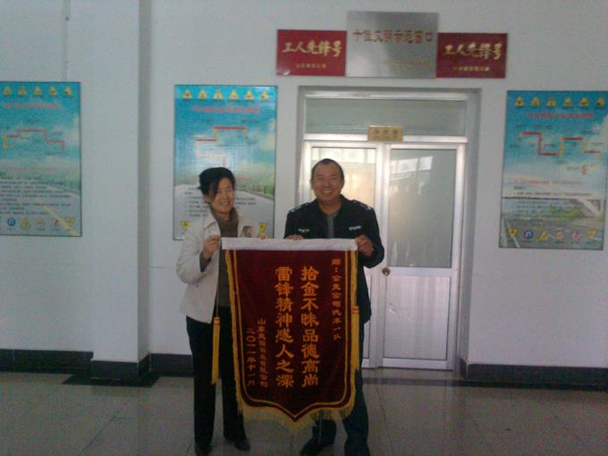 11月12日早上,山東天園銅業(yè)有限公司的耿愛(ài)華女士拿著一面寫有“拾金不昧品德高尚、雷鋒精神感人之深”的錦旗來(lái)到市公交公司汽車一隊(duì),感謝車隊(duì)駕駛員王波師傅拾金不昧的高尚品德。據(jù)車隊(duì)了解得知,11月8日,耿愛(ài)華女士乘坐王波師傅駕駛的值班車上班。上班后發(fā)現(xiàn)裝有3000多元現(xiàn)金和手機(jī)的錢包不見(jiàn)了,她心急如焚,當(dāng)時(shí)就癱坐在地上。正在這時(shí),耿愛(ài)華女士的一位同事前來(lái)告訴她丟失的錢包找到了,公交公司汽車一隊(duì)駕駛員王波師傅剛打來(lái)電話,錢包內(nèi)的3000多元現(xiàn)金和手機(jī)都在,讓她放心。原來(lái),王波師傅執(zhí)行完任務(wù)回公司打掃車內(nèi)衛(wèi)生時(shí),發(fā)現(xiàn)座位夾縫中有一個(gè)錢包,打開(kāi)一看里面那么多現(xiàn)金,心想失主一定很著急,便通過(guò)錢包內(nèi)手機(jī)記錄的電話聯(lián)系到耿愛(ài)華女士的一位同事,讓她通知耿愛(ài)華女士及時(shí)到市公交公司汽車一隊(duì)領(lǐng)取。