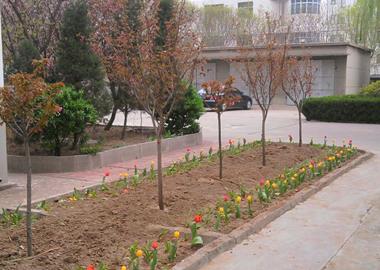 郁金香花開了,櫻花樹紅紅的小花含苞待放。 一陣微風(fēng)吹來,或春風(fēng)含面,或低頭不語,時(shí)不時(shí)引來三三兩兩的小喜鵲駐足觀望,一派春意盎然、安定祥和的美景。