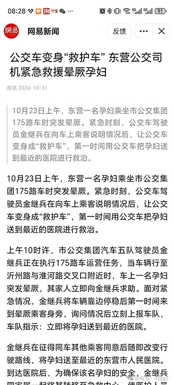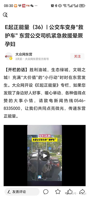市公交集團汽車五隊駕駛員金繼兵救助孕婦事跡被媒體廣泛報道,引發(fā)數(shù)十萬網(wǎng)友瀏覽,并紛紛留言點贊。